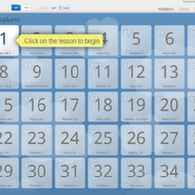 antara muka Typing Club, anda akan diajar satu persatu huruf di keyboard sehingga anda boleh menaip tanpa memandang keyboard.